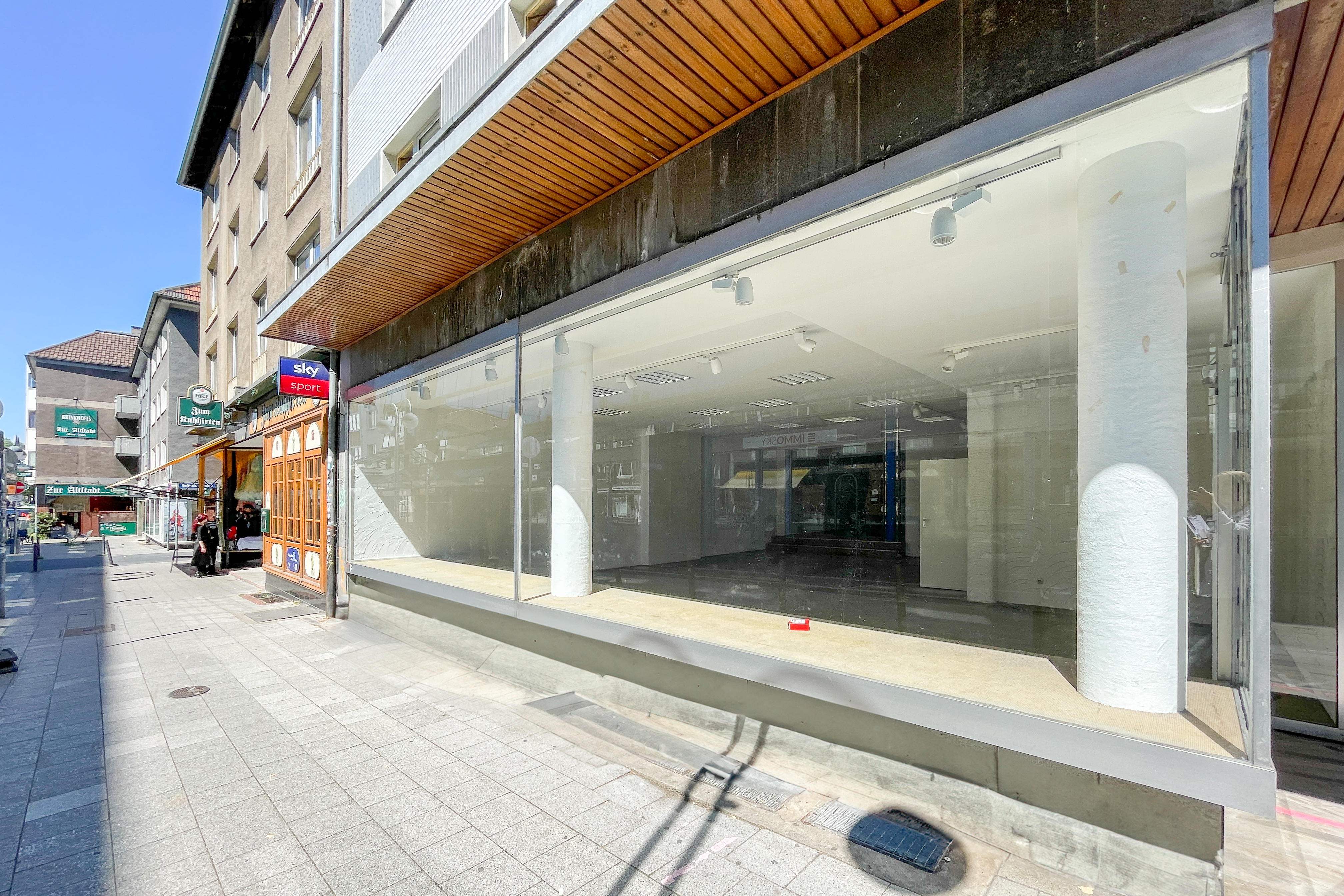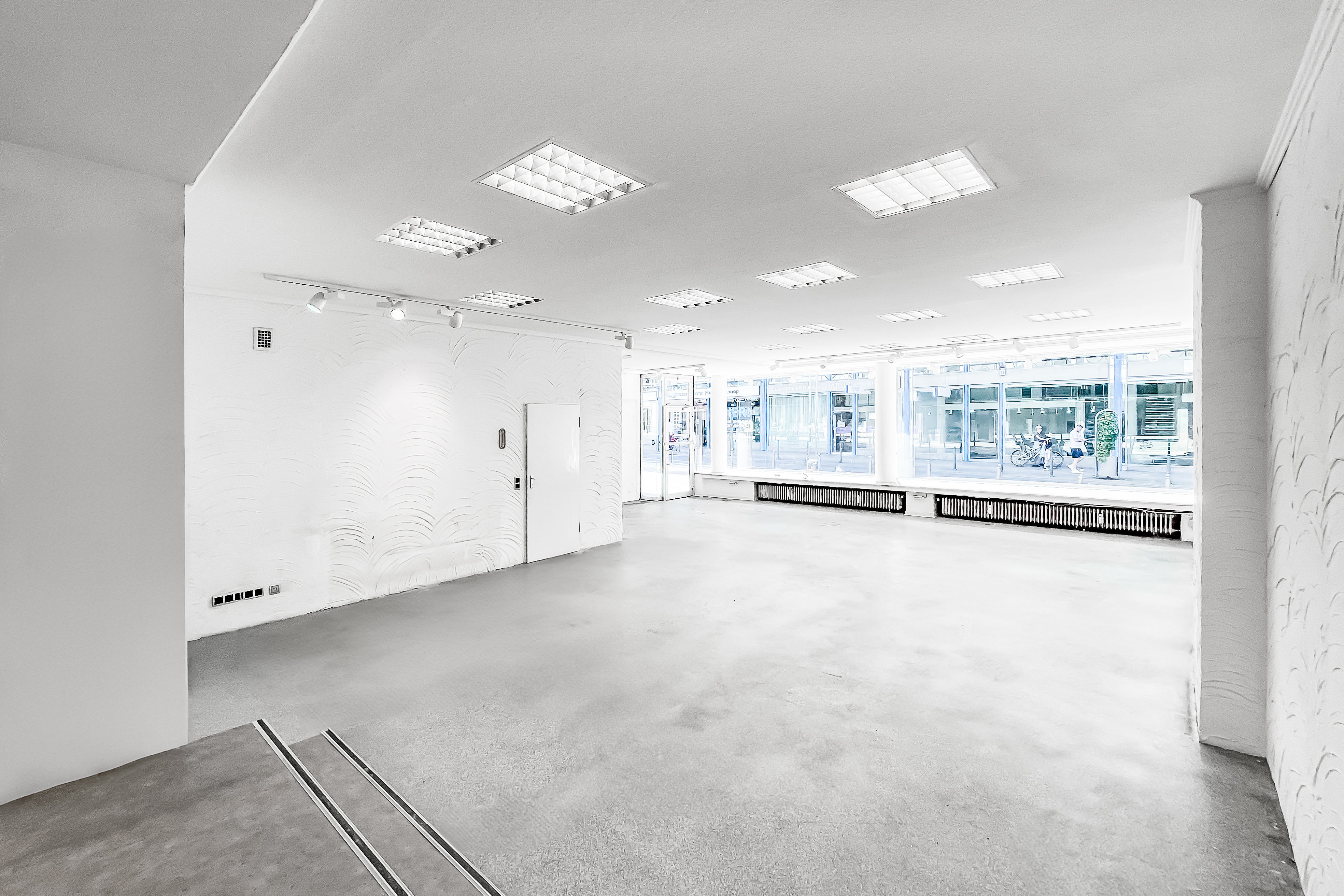 Die lichtdurchflutete Gewerbefläche im Erdgeschoss wirkt durch die große Schaufensterfront sehr einladend. Die Fensterfront kann auch zu Werbezwecken genutzt werden und sorgt aufgrund der hohen Frequenz für Aufmerksamkeit. Im hinteren Bereich der Gewerbefläche befindet sich ein Raum mit Wasseranschlüssen. Durch das Parkhaus direkt gegenüber dem Objekt sind Parkmöglichkeiten für Kunden gegeben.